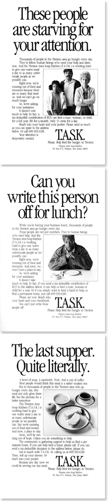 Newspaper ad campaign for the Trenton Area Soup Kitchen (TASK) in Trenton, New Jersey.